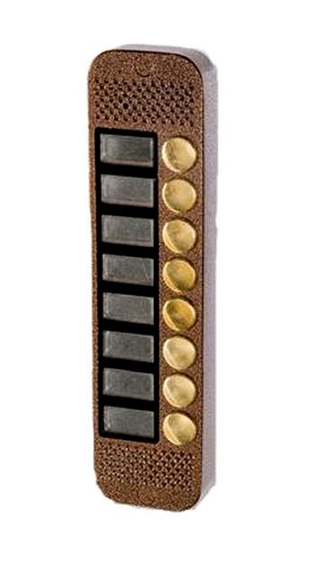 Вызывная панель видеодомофона JSB V088К БК без камеры на 8 абонентов, антивандальная, всепогодная, накладная. Данное исполнение подразумевает подключение к панели внешней видеокамеры, что позволяет осуществлять видеонаблюдение не только непосредственно перед вызывным устройством, а с любого удобного для пользователя ракурса. Синхронизация видеокамеры с вызывной панелью при этом сохраняется, т.е. видеоизображение появляется при нажатии посетителем на кнопку вызова. Встроенный контроллер электромеханического или электромагнитного замка. Функция кодонаборной панели. Подсветка номера квартиры. Звуковая и световая сигнализация открывания двери. Предназначена для работы с мониторами Kocom, Commax, KENWEI, Polyvision,Quantum,Tantos и другими; аудиоканал на базе аудиопроцессора, ИК-подсветка. Обязателен дополнительный блок питания 12 В. Температура эксплуатации от -30°C до +50°C. Габариты 60 х 240 х 22 мм. Базовые цвета: медь, серебро, черный, бронза. Дополнительные цвета: белый, серый металлик, синий антик, золото. Опционально может быть укомплектована козырьком, уголком, врезной обоймой для врезной установки. IP52.