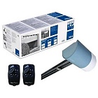 Данный комплект для организации управления секционными воротами включает в себя низковольтный привод, способный обслужить ворота секционного типа площадью до 8 квадратных метров и при высоте 2,4 метра, приемник, рейку для направления движения, а также пульт управления.