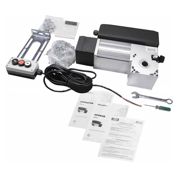 Привод может обслуживать ворота общей площадью не более 28 квадратных метров. Ворота можно закрывать и открывать как вручную, так и в автоматизированном режимах. Имеется концевой выключатель механического типа. Есть режим работы присутствия оператора. В комплекте имеется все необходимое для проведения монтажа привода «под ключ».